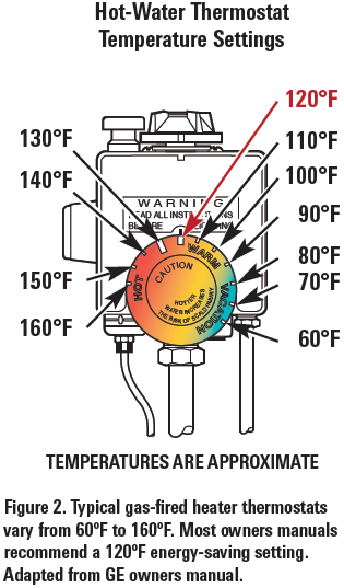 圖2示出了典型的燃?xì)鉄崴骱銣仄,該恒溫器運(yùn)行具有連續(xù)可變?cè)O(shè)置的模擬表盤(pán),范圍從VACATION模式到HOT(一些制造商標(biāo)記為頂端非常熱)。在此刻度范圍內(nèi),溫度從低到60-80ºF到高到150-160ºF。坦克制造商,EPA(環(huán)境保護(hù)局)和許多市政府建議將能效和燙傷緩解的目標(biāo)設(shè)置為120ºF。然而,OSHA,美國(guó)水暖工程師學(xué)會(huì)(ASPE)和軍團(tuán)菌專家建議至少140ºF的水殺死有害細(xì)菌[1-3]。