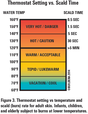 為了減少意外燙傷和保持每月帳單,大多數(shù)節(jié)能的房主將他們的熱水器設(shè)置為推薦的120ºF設(shè)置。圖3示出了健康成人的恒溫器設(shè)置對(duì)燙傷時(shí)間。注意,嬰兒,兒童和老年人具有更薄的皮膚或更慢的反應(yīng)時(shí)間,因此更易于不可逆的燒傷,即使在適度升高的溫度下。業(yè)主和維修人員必須特別注意這些乘客的防燙傷。例如,暴露于140°F水的成年人將在僅僅五秒鐘內(nèi)經(jīng)歷不可逆的二度或三度燒傷。顯然,這種熱的水是非常危險(xiǎn)的,可以導(dǎo)致嚴(yán)重傷害最有韌性的成人,更不用說(shuō)兒童,殘疾人或老人。
