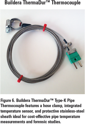 與Onset計(jì)算機(jī)公司合作,Buildera隨后進(jìn)行Beta測(cè)試,最終將未來(lái)現(xiàn)場(chǎng)測(cè)量切換到Onset®HOBO®UX120-014M四通道熱電偶數(shù)據(jù)記錄器的生產(chǎn)版本(圖5),該測(cè)量提供了更高的測(cè)量精度,電池壽命適合持續(xù)數(shù)周或數(shù)月的擴(kuò)展溫度研究。無(wú)論記錄器選擇如何,用戶必須始終測(cè)試接地環(huán)路錯(cuò)誤,并在必要時(shí)電隔離每個(gè)測(cè)量節(jié)點(diǎn)。