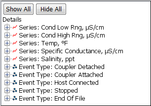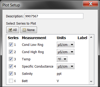 “繪圖設(shè)置”對話框列出了稱為“特定電導(dǎo)”(或您為系列名稱輸入的名稱)的系列。默認(rèn)單位為微西門子/ cm(μS/ cm)。如果需要,可以將單位更改為毫西門子/ cm(mS / cm)。鹽度的默認(rèn)單位為ppt(千分之一),不能更改。