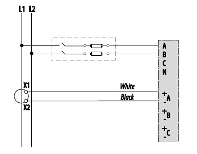電壓斷開開關(guān):電壓斷開開關(guān) 保險絲:保險絲(安裝程序負(fù)責(zé)確保遵守當(dāng)?shù)匾?沒有保險絲包含在表.) 接地線:接地線 電壓互感器:電流互感器 :電壓互感器 :包含一個電壓斷開保護(hù)用保險絲或斷路開關(guān).保護(hù)裝置必須被評為在連接可用短路電流點(diǎn).