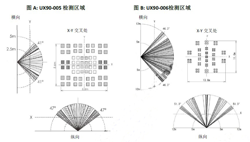 檢測性能 :UX90-005x: 水平94° (±47°); 縱向 82° (±41°) (見 圖A);UX90-006x: 水平102° (±51°); 縱向 92° (±46°) (見 圖B)