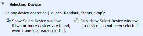 此首選項控制何時顯示“選擇設備”窗口。 如果選擇“顯示選擇設備窗口如果找到兩個或更多設備,即使已經(jīng)選擇了一個”,則當多個設備連接到計算機時,任何時候顯示選擇設備窗口。 這允許您在任何時間從設備菜單中選擇啟動,讀取,狀態(tài)或停止時選擇要使用的設備。 如果選擇“僅顯示選擇設備窗口(如果未選擇設備)”,則選擇設備窗口將僅在您首次選擇啟動,讀取,狀態(tài)或停止時顯示。 該設備將保持選中狀態(tài),直到您通過工具欄上的選擇設備圖標進行更改。
