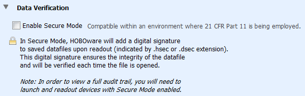 選擇此選項可啟用安全模式,并在讀出記錄器時(對于正在使用21 CFR Part 11的環(huán)境),HOBOware Pro會向新數(shù)據(jù)文件添加數(shù)字簽名。 數(shù)字簽名由hobo文件的.hsec文件擴展名和dtf文件的.dsec文件擴展名指示。 每次打開數(shù)據(jù)文件時都會驗證簽名,以確保其完整性。 默認情況下禁用此選項。