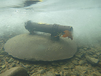 作為其“監(jiān)測天然氣發(fā)展”計(jì)劃的一部分,在特拉華州和Lackawaxen河流和在賓夕法尼亞州兩個小溪哪里鉆很可能發(fā)生的DRBC的監(jiān)控,建模與評估處已經(jīng)部署HOBO®U24電導(dǎo)率和溫度記錄儀第一。低調(diào)的混凝土基地,構(gòu)建由混凝土澆筑成一個飛碟雪橇記錄儀的安裝。兩個短鋁管從混凝土基座突出部分,和具有孔的橫PVC管位于固定到基座容納傳感器,它被固定用拉鏈的關(guān)系。在PVC管內(nèi)的傳感器的位置最小化氣泡以及沉積物可能在傳感器否則積聚。